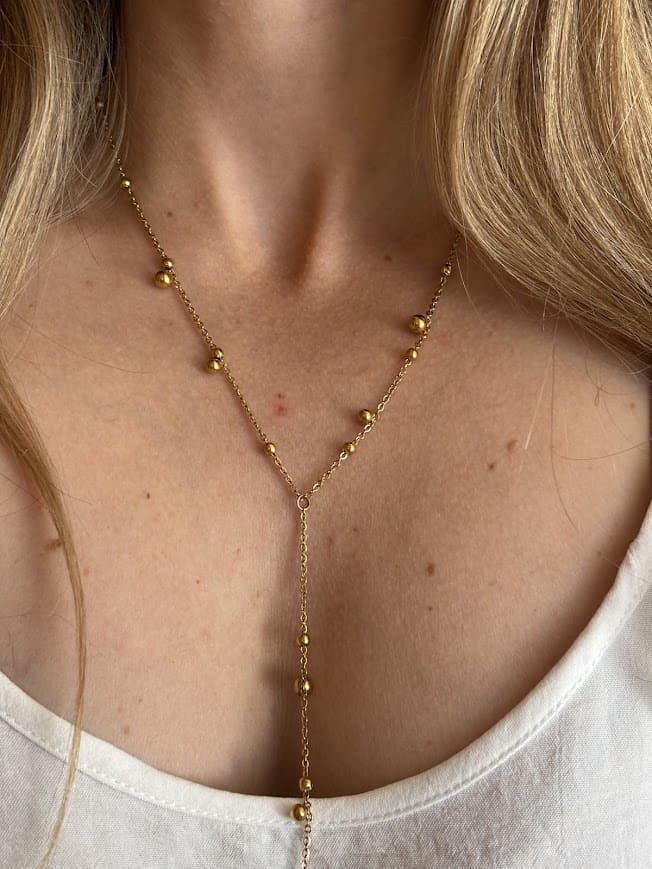 El Collar Mónaco Gold combina una delicada cadena con pequeñas esferas que caen en formato corbatero, creando un diseño elegante y moderno que estiliza el escote. Fabricado en acero inoxidable enchapado en oro, es resistente y pensado para acompañarte todos los días. Hipoalergénico y waterproof.