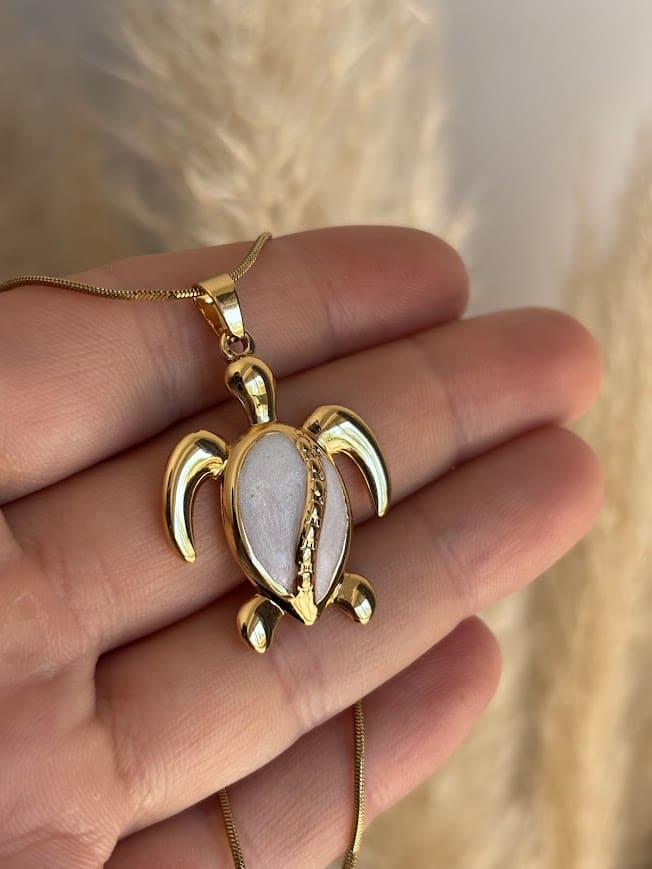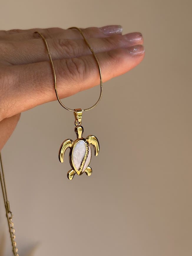🐢Cadena de acero dorado y dije de bronce bañado en metales dorados.Medidas: Largo regulable: 45 a 50cm.